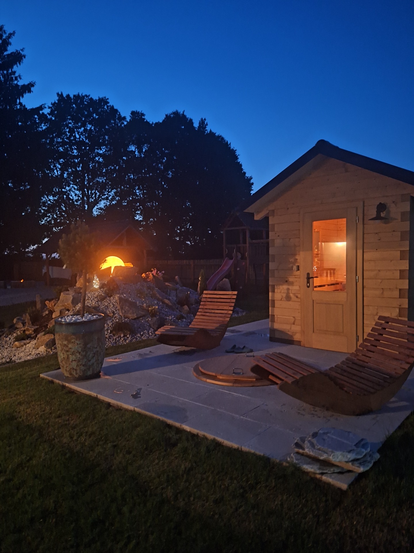 Udržovaná zahrada, s venkovním posezením, krbem a dětskými prvky